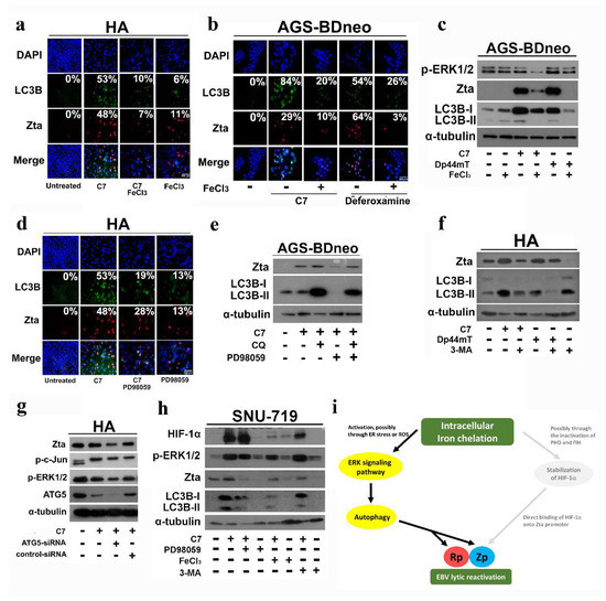 C7 and iron chelators reactivate EBV lytic cycle via intracellular iron chelation and activation of the ERK-autophagy axis. (a) HA cells were incubated with either 20 μM C7 or 20 μM iron-precomplexed C7 for 48 h. Expression of Zta (red signals) and LC3B (green signals) was analyzed by immunofluorescence staining. DAPI (blue signals) stained cell nuclei. Scale Bar: 250 μm. (b) AGS-BDneo cells were incubated with either 20 μM C7, 20 μM iron-precomplexed C7, 1000 μM deferoxamine, or 1000 μM iron-precomplexed deferoxamine for 48 h. Expression of Zta (red signals) and LC3B (green signals) was analyzed by immunofluorescent staining. DAPI (blue signals) stained cell nuclei. Scale Bar: 250 μm. (c) AGS-BDneo cells were treated with either 20 μM C7, 20 μM iron-precomplexed C7, 20 μM Dp44mT, or 20 μM iron-precomplexed Dp44mT for 48 h. The expression of Zta and LC3B was analyzed by Western blotting. (d) HA cells were incubated with either 20 μM C7 or 20 μM C7 in combination with 50 μM PD98059 (MEK inhibitor) for 48 h. Expression of Zta (red signals) and LC3B (green signals) was analyzed by immunofluorescent staining. DAPI (blue signals) stained cell nuclei. Scale Bar: 250 μm. (e) AGS-BDneo cells were treated with either 20 μM C7, 20 μM C7 in combination with 10 μM chloroquine, 20 μM C7 in combination with 50 μM PD98059 (MEK inhibitor), 20 μM C7 in combination with 50 μM PD98059 (MEK inhibitor), or 10 μM chloroquine for 48 h. The expression of Zta and LC3B was analyzed by Western blotting. (f) HA cells were treated with either 20 μM C7, 20 μM C7 in combination with 5mM 3-MA, or 20 μM Dp44mT or 20 μM Dp44mT in combination with 5 mM 3-MA for 48 h. The expression of Zta and LC3B was analyzed by Western blotting. (g) Wild-type, atg5 knockdown and scramble control knockdown HA cells were treated with 20 μM C7 for 48 h. The expression of phosphorylated-c-Jun, phosphorylated-ERK1/2, ATG5, and Zta was analyzed by Western blotting. (h) SNU-719 cells were treated with either 20 μM C7, 20 μM C7 in combination with 50 μM PD98059, 50 μM PD98059 alone, 20 μM iron-precomplexed C7, 20 μM C7 in combination with 3-MA, or 3-MA alone for 48 h. The expression of HIF-1α, p-ERK1/2, Zta, and LC3B was analyzed by Western blotting. (i) Schematic illustration of EBV lytic reactivation via the proposed intracellular iron chelation-ERK-autophagy axis.