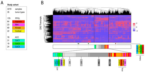 To address whether the current clinicopathological classification of ACC and PPGL remains relevant in a transcriptomic pan-cancer context, we performed unsupervised clustering and principal component analyses. RNA-seq data from 3319 tumor samples of 35 different categories from the Cancer Genome Atlas (TCGA) and Therapeutically Applicable Research to Generate Effective Treatments (TARGET) (Figure 1A, Table 1) were included.