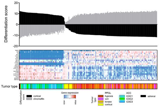 Chromaffin and cortical cell differentiation. Cortical and chromaffin cell differentiation of adrenocortical carcinoma (ACC), pheochromocytoma and paraganglioma (PPGL) and adrenal gland samples. Each column represents a unique sample that was ordered according to cortical cell differentiation. From above: differentiation scores for adrenal cortex (black) and adrenal medulla (grey). Middle; heatmap with expression values of genes representing chromaffin cells (upper half) and cortical cells (bottom half). Bottom: annotation of sample type accordingly to PPGL and ACC molecular subtypes. COC, Cluster of Clusters; Cortical, Cortical Admixture PPGL; Hypoxia, Pseudohypoxic PPGL; Kinase; Kinase signaling PPGL and Wnt, wnt-altered PPGL.