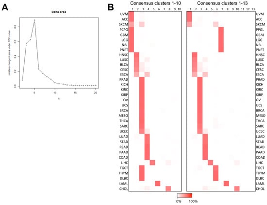 Pan-cancer consensus clustering. Unsupervised consensus clustering of 3319 TCGA and TARGET samples annotated for their specific cancer type. (A), Delta CDF plot with information on the additional explanatory power provided through increasing the number of clusters. Y-axis, relative change in the area under CDF curve and y-axis; k, the number of consensus clusters. (B), Proportion of cases assigned to the different clusters ranging from 0% (white) to 100% (red) in both 10 and 13 clusters. X-axis, consensus cluster numbers and y-axis, a cancer type.