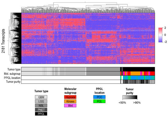 The following are available online at http://www.mdpi.com/2072-6694/10/12/518/s1, Figure S1: Bioinformatics pipeline 1. Unsupervised hierarchal clustering based on transcriptome data from 35 TCGA tumor categories with adrenal tumors annotated accordingly to molecular subtype, Figure S2: Bioinformatics pipeline 2. 1975 transcripts selected. Unsupervised clustering of 35 TCGA tumor categories with adrenal tumors annotated accordingly to molecular subtype, Figure S3: Bioinformatics pipeline 1. Unsupervised hierarchal clustering of 3319 samples annotated for TCGA tumor category with selected tumors annotated accordingly to molecular subtype, Figure S4: (A) Bioinformatics pipeline 2. 1975 transcripts selected. Unsupervised hierarchal clustering of 3319 samples annotated for TCGA tumor category with selected tumors annotated accordingly to molecular subtype. (B) Bioinformatics pipeline 2. Principal component analysis of 3319 samples with selected tumors annotated for TCGA or TARGET tumor category, Figure S5: Bioinformatics pipeline 1. Unsupervised hierarchal clustering of all ACC and SARC samples available in the TCGA database, Figure S6: Bioinformatics pipeline 1. Unsupervised clustering of 35 TCGA tumor categories as well as 8 PAAD samples annotated as PNET, Figure S7: Bioinformatics pipeline 2. 1975 transcripts selected. Unsupervised clustering of 35 TCGA tumor categories as well as 8 PAAD samples annotated as PNET, Figure S8: Bioinformatics pipeline 1. Unsupervised hierarchal clustering based on transcriptome data from 35 TCGA tumor categories with adrenal tumors annotated accordingly to molecular subtype. All samples in the PPGL cohort labeled as pheochromocytoma were removed, Figure S9: Consensus matrices of unsupervised cluster of cluster classification of 3319 TCGA and TARGET samples, Figure S10: Bioinformatics pipeline 1. Unsupervised hierarchal clustering of all PPGL as well as 8 PAAD samples annotated as PNET, Figure S11: Unsupervised hierarchal clustering of GBM, LGG, NBL, PNET and PPGL (minus cortical admixture subgroup), Table S1a: Genes preferentially expressed in Adrenocortical carcinoma (ACC) as well in as neural crest tumors (glioblastoma, low grade glioma, neuroblastoma, pancreatic neuroendocrine tumor and pheochromocytoma and paraganglioma), Table S1b: Go-enrichment analysis of genes co-expressed in Adrenocortical carcinoma (ACC) and glioma (glioblastoma and low grade glioma) and neuroendocrine tumors (neuroblastoma, pancreatic neuroendocrine tumor and pheochromocytoma and paraganglioma).