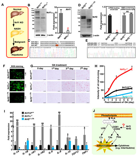 Establishment of Nrf1α-specific knockout cell models with the NASH phenotype. (A) Schematic diagrams for the liver-specific Nrf1−/− knockout mice that develop spontaneous NASH and deteriorate into hepatoma eventually. (B) Both Western blotting (WB, left) and real-time quantitative PCR (qPCR, right) were employed to identify the protein and mRNA levels of Nrf1 in a monoclonal Nrf1α−/− knockout cell line. The data are shown as mean ± SEM (n = 3 × 3, * p < 0.01). (C) Sequencing peaks of the genomic DNA fragments across Nrf1α-specific knockout site, as indicated by alignment with wild type (WT) standard sequence. (D) Expression of inactive Nrf2 mutant protein and mRNA levels in a monoclonal Nrf2−/−ΔTA cell line was identified by WB (left) and qPCR with distinct primer pairs (right). The data are shown as mean ± SEM (n = 3 × 3, * p < 0.01; NS = no statistical difference). (E) Sequencing peaks of the genomic DNA fragments across the Nrf2-specific knockout site, as indicated by alignment with normal (WT) sequence. (F) ROS staining of Nrf1/2+/+, Nrf1α−/− and Nrf2−/−ΔTA cells. They had been treated with 5 μM of 2′,7′-dichlorodihydrofluorescein diacetate (DCFH-DA) for 30 min, before being photographed under a fluorescence microscope. Scale bar = 100 μm. (G) Lipid staining of Nrf1/2+/+, Nrf1α−/− and Nrf2−/−ΔTA cells, that were or were not treated with 200 μM oleic acid (OA), before being stained with the oil red O agent, and then photographed under a microscope. Scale bar = 25 μm. (H) Statistical analysis of the above lipid-stained (G) intensity, that was quantified and shown graphically. The data are represented as mean ± SEM (n = 3), with significant increases ($) or decreases (*), p < 0.01, compared with wild-type values. (I) The expression of inflammation-related genes in Nrf1/2+/+, Nrf1α−/− and Nrf2−/−ΔTA cells. The data obtained from transcriptome, and FPKM are shown as mean ± SEM (n = 3; $, p < 0.01; $$, p < 0.001 and * p < 0.01, by comparison with wild-type). (J) Diagrammatic representation of a proposed model for Nrf1 and Nrf2 to regulate COX1 and COX2, essential for arachidonic acid metabolism and relevant inflammatory response.