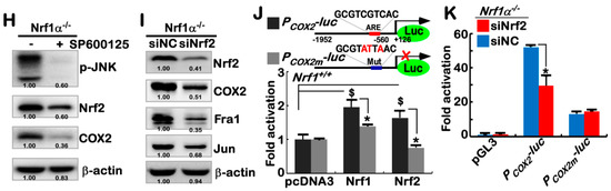 Further treatments of Nrf1α−/− cells with either of the two CREB inhibitors H-89 and BAPTA- AM [63,70] demonstrated that the elevated expression of COX2 was also unaffected (Figure S3D). However, it is, to our surprise (Figure S3E), found that the forced abundance of COX2 in Nrf1α−/− cells was sufficiently abolished by a JNK-specific inhibitor SP600125 [71]. Further investigations revealed no changes in both total mRNA and protein levels of JNK (Figure 2G and Figure S3B), but the phosphorylated JNK abundance was significantly increased in Nrf1α−/− cells, when compared with those obtained from Nrf1/2+/+ cells (Figure 2G). Therefore, it is initially postulated that Nrf1α−/− cells gave rise to the forced expression of COX2 possibly mediated by activation of JNK signaling. Next, in-depth insights into JNK signaling towards downstream target genes unraveled that expression of only c-Jun, but not other examined genes, was significantly elevated in Nrf1α−/− cells (Figure S4A,B). Further assays of two luciferase reporter genes PCOX2-Luc and PTRE-Luc (in which TRE indicates TPA-responsive element inserted within the reporter gene promoter region) verified that AP-1 (a functional heterodimer of Jun and Fos) is also favorably required for the transactivation of COX2 in Nrf1α−/− cells (Figure S4C). By defining distinct AP-1 components (e.g., Jun, Fos, Fra1) at mRNA and protein levels, it is validated that AP-1 was activated in Nrf1α−/− cells, but not in Nrf2−/−ΔTA cells (Figure S4D–F). However, Figure S4G illustrated that hyper-expression of COX2 in Nrf1α−/− cells was not suppressed by the AP-1 inhibitor SR11302 [72]. By stoichiometric analysis of knockdown of Jun or Fra1, only modest decreases of COX2 were no proportional to the silencing of Jun or Fra1 at considerably lower levels (Figure S4H). The latter notion is supported by no dose-dependent effects of silencing Jun on down-regulation of COX2 (Figure S4J, lower three panels). Taken altogether, AP-1 activation by JNK signaling is involved in, but not essential for, making a significant contribution to the reinforced expression of COX2 in Nrf1α−/− cells.