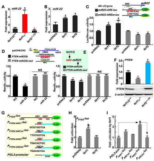 Different regulation of PTEN by Nrf1α and Nrf2 occurs through miR-22. (A) The content of miR-22 in Nrf1/2+/+, Nrf1α−/− and Nrf2−/−ΔTA cells was determined by qPCR with miR-22 specific primers. The data are shown as mean ± SEM (n = 3×3; * p < 0.01; $, p < 0.01 compared to wild-type values). (B) The miR-22 expression was altered by transfection of an expression construct for Nrf1 or Nrf2, or an empty pcDNA3 control, into Nrf1/2+/+ cells. The qPCR data are shown as mean ± SEM (n = 3 × 3; $, p < 0.01). (C) The miR22-ARE-luc reporter driven by an ARE enhancer site in the mir-22 gene promoter, and its mutant reporter miR22-AREm-luc were constructed. Either of reporter genes as indicated, together with pRL-TK, plus each of pcDNA3, Nrf1, or Nrf2 expression constructs, were co-transfected into Nrf1/2+/+ cells and then allowed for 24-h recovery before the luciferase activity measured. The data are shown as mean ± SEM (n = 3 × 3; * p < 0.01; $, p < 0.01). (D) There exists a miR-22 binding site in the PTEN’s 3’UTR region (which was constructed in the dual fluorescent psiCHECK2 vector to yield the PTEN-miR22b reporter). Either of PTEN-miR22b and PTEN-miR22b- mut was co-transfected with miR-22 expression plasmid or a negative control (NC) into Nrf1/2+/+ cells, and then allowed for 24-h recovery, before the fluorescent activity was determined. The data are shown as mean ± SEM (n = 3 × 3; * p < 0.01; NS = no statistical difference). (E) Either PTEN-miR22b or PTEN-miR22b-mut was co-transfected with each of pcDNA3, Nrf1, or Nrf2 expression constructs Nrf1/2+/+ cells and allowed for 24-h recovery, before the fluorescent activity was measured. The data are shown as mean ± SEM (n = 3 × 3; * p < 0.01). (F) Both the mRNA (upper) and protein (lower) levels of PTEN in Nrf1/2+/+, Nrf1α−/− and Nrf2−/−ΔTA cells were determined by qPCR and Western blotting, respectively. The data are shown as mean ± SEM (n = 3 × 3; * p < 0.01; $, p < 0.01). (G) Schematic representation of the PTEN promoter-containing PPTEN-luc plasmid, its distinct ARE-driven reporters (PARE1-luc and PARE2-luc) and indicated mutants, which were constructed into the PGL3-Promoter (i.e., PGL3-Pro) vector. (H) The PPTEN-luc and pRL-TK, along with an expression construct for Nrf1 or Nrf2, or pcDNA3 were co-transfected into Nrf1/2+/+ cells and then allowed for 24-h recovery before being measured. The luciferase activity data are shown as mean ± SEM (n = 3 × 3; $, p < 0.01). (I) Nrf1/2+/+ cells were subject to co-transfection with an indicated luciferase reporter, together with pRL-TK and Nrf1 expression construct or pcDNA3 for 24 h before being determined. The data are shown as mean ± SEM (n = 3 × 3; $, p < 0.01; * p < 0.01).