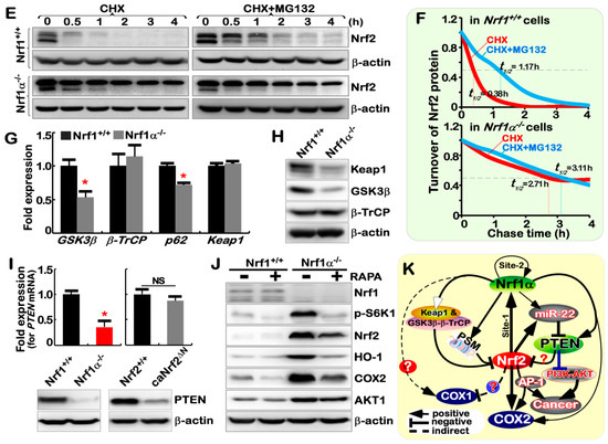 Based on the fact that loss of PTEN function leads to constitutive activation of the PI3K-AKT signaling pathway to augment the nuclear accumulation of Nrf2 and its resulting activation [17,18], we determined whether the PI3K-AKT signaling is activated by abolishment of PTEN in Nrf1α−/− cells (where Nrf2 is aberrantly accumulated). The results demonstrated Nrf1α−/−-leading increased abundances of Nrf2, AKT1, COX2 and HO-1, but their increases were also significantly suppressed by rapamycin (RAPA, a classic mTOR inhibitor) (Figure 5J). This implies that mTOR signaling may be constitutively activated in Nrf1α−/− cells. Accordingly, the increased abundances of both AKT and phospho-S6K1 in Nrf1α−/− cells were markedly blocked by the mTOR inhibitor RAPA. This appears inversely correlative with the consequence that over-expression of Nrf1 suppresses AKT induction [36]. Taken together, this further indicates mutual opposing and unifying cross-talks between Nrf1α and Nrf2 to regulate the PTEN-mTOR-AKT signaling towards the Nrf2-COX2 pathway.