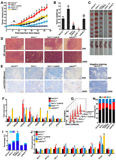 Distinctive animal tumor phenotypes of Nrf1α−/−, Nrf1α−/−+siNrf2, Nrf2−/−ΔTA and caNrf2ΔN derived from Nrf1/2+/+ cells. (A) Differences in mouse subcutaneous xenograft tumors derived from Nrf1/2+/+, Nrf1α−/− Nrf1α−/−+siNrf2, Nrf2−/−ΔTA and caNrf2ΔN cells were measured in size every two days, before being sacrificed on the 32nd day. The data are shown as mean ± SEM (n = 6 per group, * p < 0.01; $, p < 0.01, NS = no statistical difference at the early incubation phase). (B) The final tumor weights of all groups were calculated and the data are shown as mean ± SEM (n = 6, ** p < 0.001; $, p < 0.01, NS = no statistical difference, when compared to the wild-type). (C) Distinctive animal xenograft tumors derived from Nrf1/2+/+, Nrf1α−/− Nrf1α−/−+siNrf2, Nrf2−/−ΔTA and caNrf2ΔN cells. (D) The histological photographs of indicated tumors were achieved by HE (hematoxylin & eosin) staining. The scale bar = 200 μm in ×40 pictures, or = 100 μm in ×200 pictures. (E) Evaluation of tumor angiogenesis by immunohistochemical staining with a specific marker CD31 antibody. The negative staining was set up by the non-immune serum to replace the primary antibody. Scale bar = 500 μm (×40) or = 100 μm (×200). (F) The qPCR analysis of some angiogenesis-related genes in distinct cells as indicated was validated by transcriptome. The data are shown as mean ± SEM (n = 3 × 3, * p < 0.01, ** p < 0.001; $, p < 0.01; $$, p < 0.001). (G,H) The flow cytometry analysis of distinct cell cycle was indicated. The data (n = 3) are shown in two different fashions. (I) The early apoptosis (EA) and late apoptosis (LA) of five distinct cell lines were examined by flow cytometry. The data are shown as mean ± SEM (n = 9; $, p < 0.01). (J) Expression of some apoptosis-related genes in indicated cells was transcriptomically analyzed. The data are shown as mean ± SEM (n = 3, * p < 0.01, ** p< 0.001; $, p < 0.01; $$, p < 0.001).