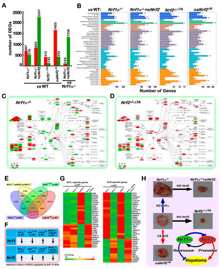 2.10. Different Subsets of Genes Are Finely Regulated by Nrf1α, Nrf2 Alone or Both