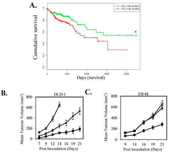 IL-11 signaling is associated with poorer survival in colorectal cancer (CRC) patients and drives increased tumor growth. (A) The relationship between high (Green) and low (Red) IL-11-IL-11Rα-SOCS3 gene expression with patient survival was determined through mining a SurvExpress TCGA dataset. Kaplan-Meier survival curves were evaluated from the TCGA, n = 350; Risk group hazard ratio = 1.13 (Conf. Int. 1.15~2.93); * p < 0.05. (B) DLD-1 control (●) and IL-11Rα transfected stable clones (IL-11R-1 (□) and IL-11R-2 (Δ)) and (C) SW48 control (●) and IL-11Rα transfected stable clones (IL-11R-1 (□) and IL-11R-2 (Δ)) were inoculated subcutaneously into both flanks of BALB/cnu−/nu− female mice and measured for tumor volume. Data shown represents mean ± SEM (n = 10 tumors/group).