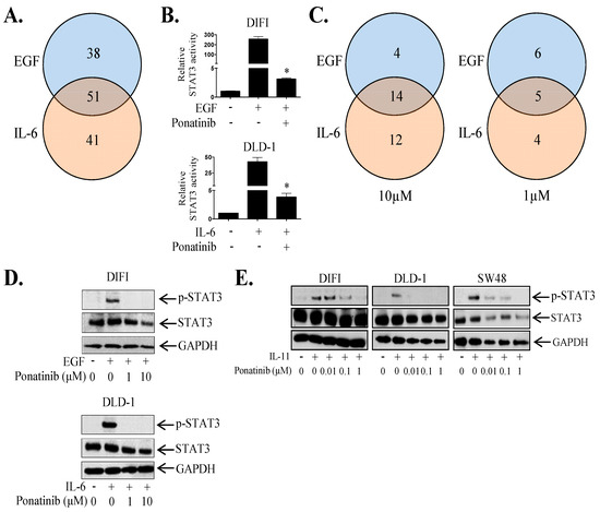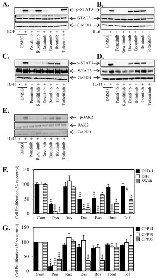 The following are available online at http://www.mdpi.com/2072-6694/10/12/526/s1, Figure S1: Stable transfection of IL-11Rα increase STAT3 activity and SOCS3 gene expression, Figure S2: Ponatinib inhibits EGF and IL-6 mediated SOCS3 gene expression, Figure S3: Ponatinib inhibits IL-11 mediated STAT3 activity, Figure S4: Ponatinib displays broader STAT3 inhibition compared to JAK and SRC inhibitors, Figure S5: Ponatinib inhibits Cell Migration, Table S1: The effect of 1167 agents on EGF and IL-6 mediated STAT3 activity, Table S2: The effect of 50 “lead” compounds on EGF, IL-6 and IL-11 driven STAT3 transcriptional activity and phosphorylation, Table S3: The effect of Ponatinib, Dasatinib and Bosutinib on the proliferation of human colon cancer cell lines.