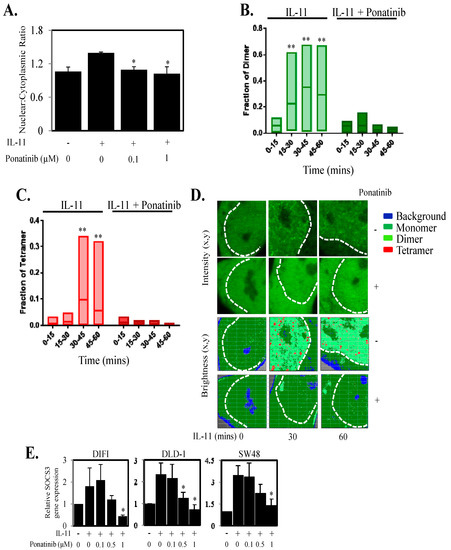 As Ponatinib reduced STAT3 phosphorylation and transcriptional luciferase activity, we next explored whether Ponatinib could inhibit STAT3 localization and transcriptional function in the nucleus. DLD-1 cells transiently transfected with STAT3-GFP and stimulated with IL-11 displayed an increase in STAT3 nuclear to cytoplasmic ratio compared to unstimulated cells (1.39 vs. 1.06) (Figure 3A). Ponatinib significantly reduced the STAT3 nuclear to cytoplasmic ratio mediated by IL-11 at both 0.1 µM (1.09) and 1 µM (1.02) (Figure 3A). As STAT3 dimer and tetramer formation in the nucleus has been shown to be important for regulating gene expression [35] we next determined if Ponatinib could reduce STAT3 dimer and tetramer formation. DLD-1 cells transiently transfected with STAT3-GFP and stimulated with IL-11 displayed an increase in STAT3 dimer and tetramer formation within 15–30 min of stimulation (Figure 3B,C), while Ponatinib significantly inhibited IL-11 induced STAT3 dimer and tetramer formation in DLD-1 cells equivalent to basal levels (Figure 3B–D). Finally, as Ponatinib reduced STAT3 nuclear localization and dimer and tetramer formation in the nucleus we examined if Ponatinib could reduce gene expression driven by STAT3. IL-11 triggered increased SOCS3 gene expression in DIFI, DLD-1 and SW48 cells while Ponatinib reduced this IL-11 mediated SOCS3 gene expression in a dose dependent manner (Figure 3E). This was further confirmed in four other CRC cell lines (Figure S2C).