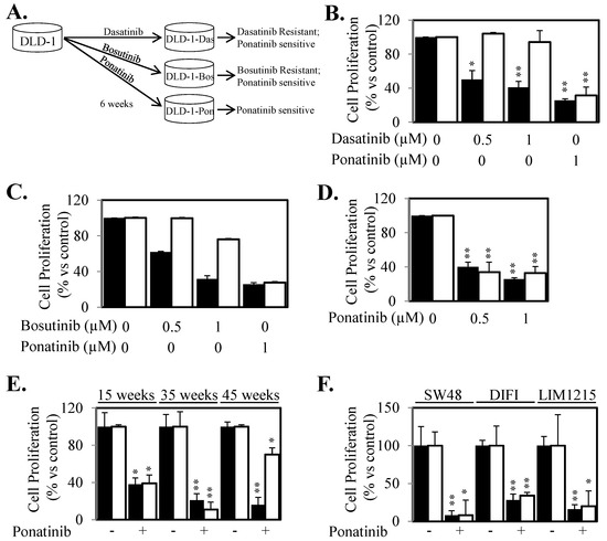Cells do not acquire resistance to Ponatinib as rapidly as Dasatinib and Bosutinib. (A) Schematic of long-term treatment with Dasatinib, Bosutinib and Ponatinib. DLD-1 cells were treated with continuous, increasing doses of Dasatinib, Bosutinib and Ponatinib for six weeks and then assessed for cell viability in comparison to control DLD-1 cells. (B) DLD-1 (■) and DLD-1-Das cells (□), were treated with ± Dasatinib or Ponatinib for 72 h. Cell viability was then determined using a commercially available Cell Titer-Glo kit and samples read on a bioluminometer. Data is expressed as % viability compared to untreated control cells ± S.D. (C) DLD-1 (■) and DLD-1-Bos cells (□), were treated with ± Bosutinib or Ponatinib for 72 h. Cell viability was then determined as outlined above. (D) DLD-1 (■) and DLD-1-Pon cells (□), were treated with ± Ponatinib for 72 h. Cell viability was then determined as outlined above. (E) DLD-1 (■) and DLD-1 cells that had been co-cultured in the presence of Ponatinib for 15, 35 and 45 weeks (□), were treated with ± Ponatinib for 72 h. Cell viability was then determined as outlined above. (F) SW48, DIFI and LIM1215 cells (■) and their counterparts that had been co-cultured in the presence of Ponatinib for greater than four months (□), were treated with ± Ponatinib for 72 h. Cell viability was then determined as outlined above from at least three independent experiments, each with 3 experimental replicates; * p < 0.05; ** p < 0.01.