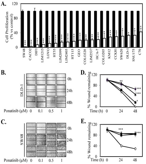 Ponatinib inhibits cell proliferation and migration. (A) Cells were treated with vehicle (■) or 1 µM Ponatinib (□) for 72 h. Cell viability was then determined using a commercially available Cell Titer-Glo kit and samples read on a bioluminometer. Data is expressed as % viability compared to untreated control cells ± S.D. (B) DLD-1 and (C) SW48 cells were grown to confluency, then “wounded” at time 0 h. Cells were then treated with 0, 0.1, 0.5 and 1 μM of Ponatinib for 48 h. Images of wound healing were taken at 0, 24 and 48 h post Ponatinib treatment. Graphical representation of % wound remaining relative to control treated cells at time 0 h for (D) DLD-1 and (E) SW48 cells treated with Ponatinib at 0 (○), 0.1 (■), 0.5 (▲) or 1 µM (●). Results are normalized to untreated control. Data points represent mean ± SD of at least three independent experiments, each with three experimental replicates; * p < 0.05; ** p < 0.01; *** p < 0.001.