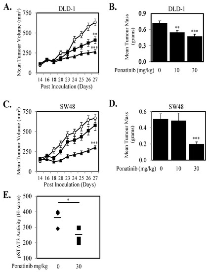 Ponatinib inhibits tumor growth in vivo. (A,B) DLD-1 and (C,D) SW48 cells were subcutaneously injected into BALB/cnu/nu female mice. On day 14 when mean tumor volume had reached 100–150 mm3, mice were randomly separated into three groups and treated orally with daily doses of Ponatinib at 0 (○), 10 (■) or 30 mg/kg (▲) for 10 days between days 14–23 post inoculation. (A) DLD-1 and (C) SW48 data shown represents mean ± SEM (n = 10–12 tumors/group), and tumor mass at the end of the experiment were weighed for (B) DLD-1 and (D) SW48 and presented as mean tumor mass ± S.D. (n = 10–12/group) ** p < 0.01 and *** p < 0.001 relative to the vehicle treated group. (E) Mice bearing DLD-1 xenografts of approximately 200 mm3 were treated orally with Ponatinib at doses of 0 or 30 mg/kg for 2 h. Xenografts were then removed, embedded in paraffin and sections were stained for phosphorylated STAT3. H Scores were assigned based on staining intensity of at least three random fields of view from four sections from each group; * p < 0.05; ** p < 0.01; *** p < 0.001.