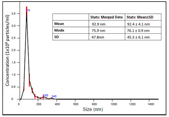 CaCO3 NCs were synthesized according to the literature, as described in the Materials and Method section [6,9]. The preparation technique adopted herein allows one to obtain stable calcite nanocrystals which are very advantageous since they do not provoke adverse cellular reactions and do not block the normal cell cycle [34]. CaCO3 NCs have an ellipsoidal shape and in order to study their size, together with Transmission Electron Microscopy (TEM) and Dynamic Light Scattering (DLS) measurements (summarized in Table 1) [9], nanoparticle tracking analysis (NTA) was also performed by means of a Nanosight instrument (Malvern, Worcestershire, UK). High resolution particle size, concentration and aggregation measurements under Brownian motion of the NCs suspensions were measured in order monitor in real time the subtle changes in the characteristics of particle populations. The results on size distribution are summarized in Figure 1. CaCO3 NCs have a dimension of about 76.1 ± 0.9 nm.
