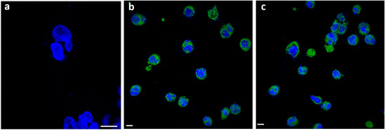 Confocal images of a negative control (a), Fluorescein isothiocyanate (FITC)-CaCO3 NCs after 5 h (b), and 24 h (c) in HUT78 cells. In blue are stained nuclei and in green CaCO3 NCs. Scale bar, 5 µm.