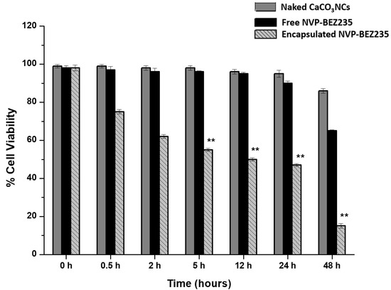 Biological tests in order to verify the effectiveness of the system were assessed. We studied the effects on cell proliferation of 1.0 mg naked CaCO3 NCs, free-NVP-BEZ235 (1 μM) and encapsulated NVP-BEZ235 prepared at the final concentration of 1 μM equivalent on T-cell lymphoma line at increasing times (from 30 min up to 48 h) by MTT assay.