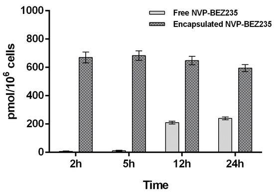 The results, shown in Figure 4 and Figure 5, suggested that the uptake of free NVP-BEZ235 in the cells occurred in the first hour of incubation. After being stored in vesicles, it slowly diffused in the cytosolic fraction over the next 24 h, reaching a concentration of about 0.23 nmol/106 cells. On the other hand, the uptake of nano-encapsulated NVP-BEZ235 in the cytosolic fraction occurred during the first 2 h of incubation reaching the concentration of about 0.67 nmol/106 cells and remaining quite stable over about 12 h.