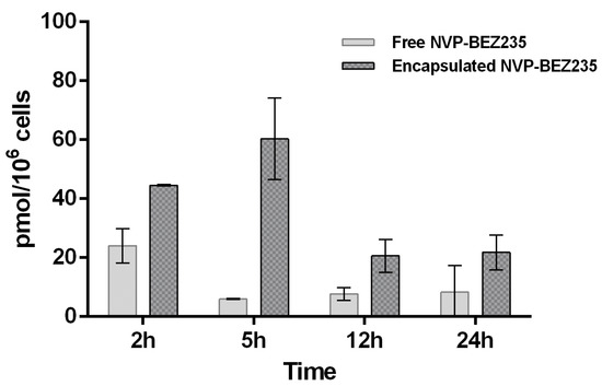 Comparison of intracellular concentrations of NVP-BEZ235 (in the cytosolic fraction) after exposure of T-cell lymphoma line for 2, 5, 12 and 24 h to the free drug (plain gray) and nano-encapsulated drug (gray pattern). The bars are plotted as mean and error bars represent the SD. (n = 3).