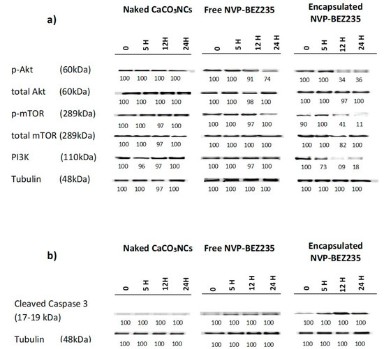 Western blots of cellular extracts from HUT78 cell line treated with naked CaCO3 NCs, free NVP-BEZ235 (1 μM) and encapsulated NVP-BEZ235 (1 μM equivalent) for 5, 12 and 24 h. (a) Lysates were probed with antibodies against the cleaved form of caspase 3 (Asp175); (b) Lysates were probed with antibodies against PI3K, p-Akt (Ser473), total Akt, p-m-TOR (Ser2448) and total m-TOR (Ser2448). Densitometric quantification of bands normalized to the untreated control is shown below the immunoblot bands.