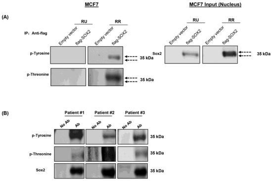 RR cells had higher phosphorylation of Sox2. Immunoprecipitation experiments were carried out using RU and RR cells derived from MCF7 cells transfected with flag-SOX2. Precipitation was carried out using the anti-flag M2 affinity gel and Western blot was carried out using Sox2, p-Tyrosine and p-Threonine antibodies. (A) Right panel represents immunoprecipitation of flag-Sox2 pulled down in both RU and RR cells derived from MCF7 cells. Of note, two bands of Sox2 were identified in RR cells whereas only one band was identified in RU cells. Left panel represents Western blots results probed with anti-phospho-tyrosine (p-tyrosine) and anti-phospho-threonine (p-threonine) revealed evidence of Sox2 phosphorylation in RR but not RU cells; (B) Western blot of Sox2 was performed using 3 patient tumor samples. Immuno-reactivity with anti-p-tyrosine and anti-p-threonine was detected in all 3 samples.