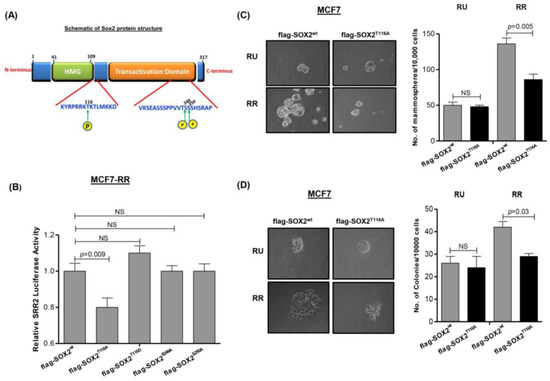 Phosphorylation of Sox2 at T116 contributes to RR phenotype. (A) Schematic of Sox2 protein structure and potential phosphorylation sites; HMG=high mobility group domain (B) Transfection of the flag-SOX2T116A mutant into RR cells derived from MCF7 cells significantly decreased the SRR2 luciferase reporter activity as compared to the cells transfected with the flag-SOX2wt vector. In comparison, transfection of three other Sox2 mutants (flag-SOX2S249A, flag-SOX2S250A and flag-SOX2T116D) did not result significant changes in the SRR2 luciferase reporter activity; (C) Transfection of flag-SOX2T116A mutant into RR cells derived from MCF7 cells resulted in a significantly lower mammosphere formation capability compared to cells transfected with flag-SOX2wt vector. In RU cells, the mammosphere formation capability was relatively low, and transfection of flag-SOX2T116A mutant did not result in appreciable changes; (D) Transfection of the flag-SOX2T116A mutant into RR cells derived from MCF7 cells resulted in a significantly lower methylcellulose colony formation, compared to cells transfected with flag-SOX2wt vector.