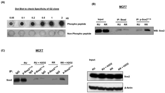 Acquisition of Sox2T116 phosphorylation occurs upon oxidative stress. (A) Dot blot experiment was performed and results showed that G2 antibody was reactive with pSox2T116 in a concentration-dependent manner. Furthermore, G2 had no immunoreactivity toward the unphosphorylated Sox2 peptide; (B) Immunoprecipitation experiments were performed and G2 clone pulled down Sox2 protein in RR but not RU cells derived from MCF7 cells. Input shows an equal amount of Sox2 protein was expressed in RU and RR cells; (C) Immunoprecipitation experiment was performed using RU and RR cells derived from MCF7 cells with or without exposure to oxidative stress (H2O2). RU cells ‘acquired’ Sox2 phosphorylation at T116 after oxidative stress.