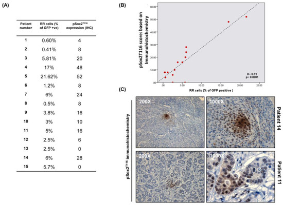 Immunohistochemical studies of pSox2T116 in primary BC tumors. (A) 15 primary BC tumors showing % of RR cells detected by flow analysis and pSox2T116 expression detected by immunohistochemistry; (B) Spearman’s rank correlation was carried out between % of RR cells detected by flow analysis and pSox2T116 expression detected by immunohistochemistry. Positive correlation was observed between % of RR cells and pSox2T116 expression (R = 0.91; p = 0.0001); (C) Two representative images have been shown here for pSox2T116 immunohistochemistry.