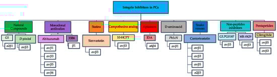 Representative flowchart of integrin inhibitors used against PCa. The flowchart depicts seven different groups of integrin inhibitors with their respective integrin receptors that were studied as drug targets in PCa.