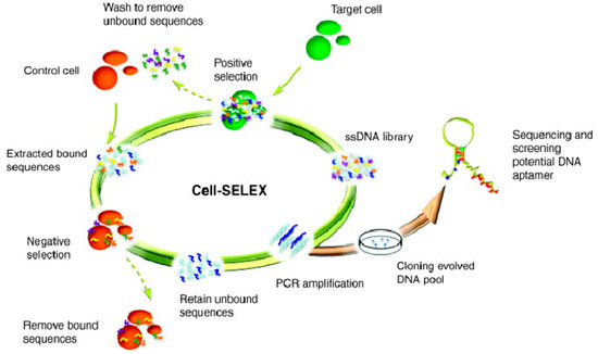 The cell-SELEX process (Figure 1) commonly begins with a large random library of about 1 × 1013~1 × 1016 ssDNA or ssRNA molecules. These molecules are repeatedly incubated with two types of cells, including specific cancer cell types, as the targets, and normal cells, or other types of cancer cells, as counter controls. These molecules undergo repeated interaction with the target of interest, progressively winnowing out non-binders, thus making it possible to obtain aptamer probes which specifically bind only to the targeted cancer cells, while molecules with nonspecific binding to the counter control cells are removed. These enriched molecules are amplified by polymerase chain reaction (PCR). The survivors are sequenced and used as molecular probes [23].