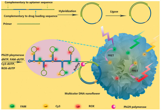 Fluorophores can be modified on the end of an aptamer through phosphoramidite chemistry. The aptamers will then emit fluorescence for in vivo imaging when the needed photons are provided. The signal for a single aptamer is low, but it will increase when the aptamers circulate and accumulate after reaching the desired target. Further, multiple dyes can be labeled on a given aptamer via chemical reactions or interactions, such as biotin and streptavidin pairing [37], to further amplify fluorescence signaling, enabling easy and rapid identification of the target cells for diagnosis. Hu et al. [38] reported DNA nanoflowers (NFs) conjugated with a fluorescent resonance energy transfer aptamer by rolling circle replication reaction (RCA) to realize cellular imaging and cancer-targeted treatment (Figure 2). NFs covalently modified with three dye molecules generated multifluorescence emissions by a single-wavelength excitation.
