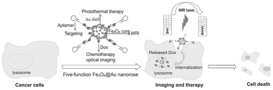 - Li, C.; Chen, T.; Ocsoy, I.; Zhu, G.; Yasun, E.; You, M.; Wu, C.; Zheng, J.; Song, E.; Huang, C.Z. Gold-coated Fe3O4 nanoroses with five unique functions for cancer cell targeting, imaging, and therapy. Adv. Funct. Mater. 2014, 24, 1772–1780. [Google Scholar] [CrossRef] [PubMed]