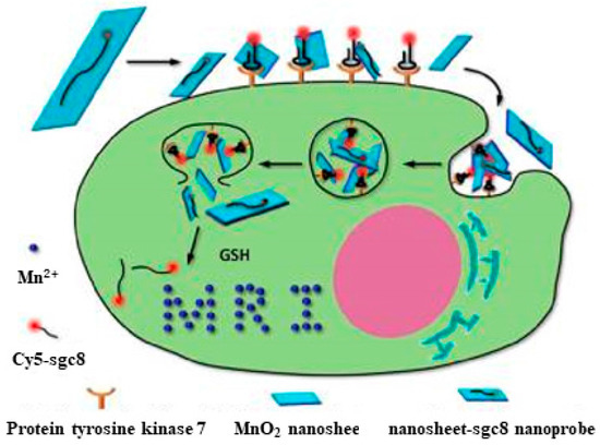 Activation mechanism of the MnO2 nanosheet-aptamer nanoprobe for fluorescence/MRI bimodal tumor cell imaging. Reprinted with permission from © (2014) American Chemical Society [42].