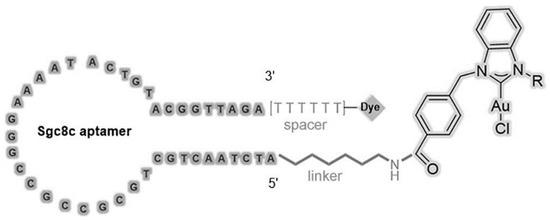 Schematic illustration of aptamer-NHC-Au1 conjugate. Reprinted with permission from © (2016) WILEY-VCH Verlag GmbH & Co. KGaA [48].