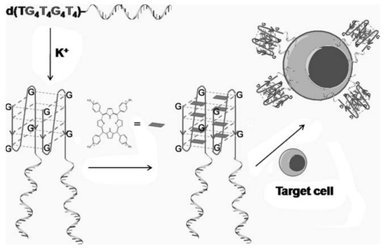 Schematic illustration of a G-quadruplex-aptamer. TMPyP4 is delivered with the G-quadruplex as the drug carrier and the aptamer as the targeting molecule. The helical strand is the aptamer. Reprinted with permission from © (2011) WILEY-VCH Verlag GmbH & Co. KGaA [51].