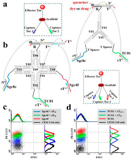 Schematic illustration of modular logic gates assembly for targeted photodynamic therapy. (a) Two-input trivalent “Y”-shaped Nano-Claw and (b) Three-input tetravalent “X”-shaped Nano-Claw. (c,d) Flow cytometry experiments to determine the best cDNA sequences with high Cy5.5 fluorescence signal (from biotin-labeled TC01, Sgc4f or Sgc8c aptamer) and low FITC fluorescence signal (labeled on the candidate strands). Reprinted with permission from © (2014) American Chemical Society [61].