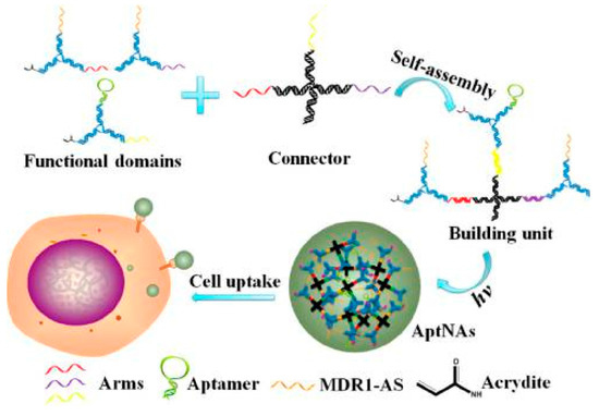 Many DNA-based building units with 5′-modification of acrydite groups were further photocrosslinked into an aptamer-based nanoassembly structure to realize selective recognition and transport with high programmability, and excellent biostability and biocompatibility. The Tan group also developed other strategies for photothermal therapy based on nanomaterial-aptamer conjugates [63,64].