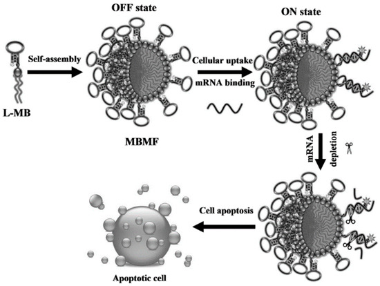 Genetic therapy has been introduced into somatic tissues to treat many diseases, including cancer, using antisense oligonucleotides, plasmid DNA, or RNA interference [65,66,67,68,69]. DNA fragments can hybridize with these complementary sequences, e.g., the loop portion of a molecular beacon structure [70,71], which greatly facilitates the improvement of gene therapy or disease diagnosis. Li et al. reported size-controllable and stimuli-responsive DNA nanohydrogels, incorporating aptamers as effective targeted gene therapy vectors (Figure 10) [72]. DNA was used for gene therapy vectors constructed through a self-assembly process using three kinds of building units. Through this facile modular assembly, these aptamer-based DNA nanohydrogels hold great promise for targeted gene therapy with superior biocompatibility and efficient cellular uptake. Chen et al. designed a sensitive and selective approach based on molecular beacon micelle flares (MBMF) for mRNA detection and gene therapy (Figure 11) [73]. MBMF hybridization can lead to apoptosis of cancer cells by inducing gene silencing.
