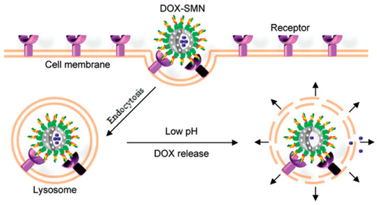 Schematic illustration of SMNs for targeted cancer chemotherapy. Owing to surface coating of aptamers, DOX-SMNs specifically enter target cancer cells through receptor-mediated endocytosis and reside in acidic lysosomes. Reprinted with permission from Reference [76]. © (2011) American Chemical Society.