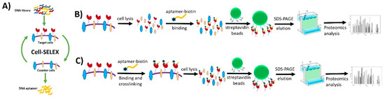 Aptamer-based isolation of target protein biomarkers with crosslinking aptamers and target proteins for cancer cell surface biomarker discovery. (A) Cell-SELEX technology selects a panel of aptamers capable of distinguishing molecular differences between two types of cells. (B) Aptamer-assisted affinity purification without cross-linking aptamers and target proteins as targets proteomics strategy for cancer cell surface biomarker discovery. (C) Aptamer-assisted affinity purification with cross-linking aptamers and target proteins as targeted proteomics strategy for cancer cell surface biomarker discovery. Reprinted with permission from © (2017) American Chemical Society [95].