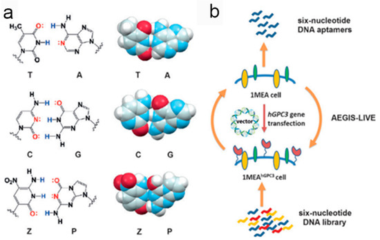 Schematic illustration of hybridization of the six nucleotides for an artificially expanded genetic information system (AEGIS) in Laboratory In Vitro Evolution (LIVE). (a) Molecular structures and space-filling models of C:G, T:A, and Z:P pairs showing their similarity; (b) Application of the artificial aptamers in biomarker discovery based on the AEGIS-LIVE selection procedure. Reprinted with permission from © (2016) WILEY-VCH Verlag GmbH & Co. KGaA [96].