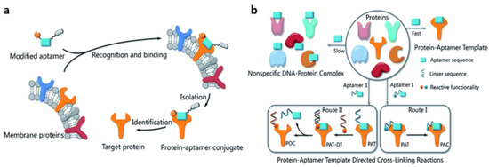 A superior strategy called “parallel mode” was introduced by Shangguan and Wang et al. using a formaldehyde crosslinking concept [98]. Two aptamers, Sgc3b and Sgc4e, were successfully utilized to identify the corresponding biomarker protein selectin L and integrin α4 of Jurkat cells. A fluorophore was linked with the aptamer to track and optimize the binding by flow cytometry analysis. The authors adopted a quantitative proteomic method by labeling a stable isotope on amino acids when culturing Jurkat cells, and they utilized crosslinked, aptamer-based affinity purification by a streptavidin agarose resin. Finally, the target proteins were identified via SDS-PAGE and LC-MS/MS after heating for 1 h at 95 °C. They recommended this method for elucidation of general protein targets.