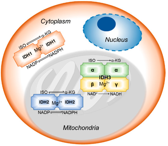IDH3 is an NAD+ dependent isozyme located in mitochondria with essential roles in Krebs cycle. IDH3 catalyzes an irreversible reaction unlike its counterparts and is regulated by allosteric effectors [8]. Also, in contrast to IDH1 and IDH2, the heterotetrameric IDH3 is not subjected to cancer mutations (Figure 1).