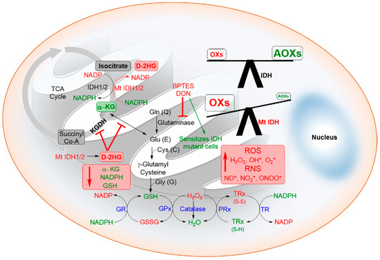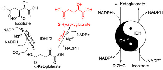 IDH1 and IDH2 play a cytoprotective role against ROS, radiation, and other damage lesions [114]. As such, protection against the cellular stress induced by selenium or staurosporine has been reported. The reducing equivalent, NADPH, generated as a byproduct is important in this cytoprotection. NADPH is a vital component in maintenance redox homeostasis, biosynthesis of lipids, nucleotides, and recycling of oxidized glutathione to reduced GSH. α-KG, an antioxidant by itself along with the GSH and thioredoxin antioxidant systems remain downregulated in IDH-mutant cells. The attenuation of NRF2-mediated gene expression also contributes to the increased redox imbalance found in cancers.