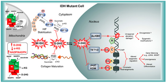 A wide variety of molecular changes that occur due to the competitive inhibition of α-KG-dependent dioxygenases by D-2HG, namely the prolyl hydroxylase domain 1 (PHD) resulting in defective collagen maturation and stabilization of hypoxia-inducible factor (HIF1), inactivation of ALKBH repair that promotes tumorigenesis, inhibition of TET1/2-mediated catabolism of 5′-methylcytosine and Jumanji-domain containing histone demethylases (JmjC KDM) that enforce epigenetic modifications of DNA and consequently the gene silencing in IDH1/2 mutant cells are shown.