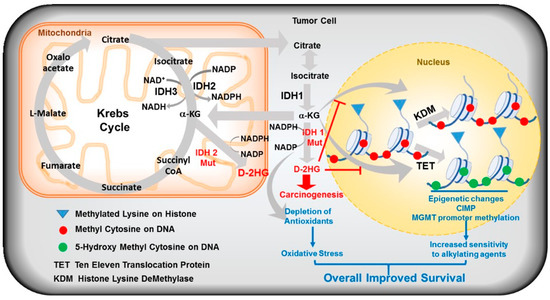 IDH mutations serve an important role as prognostic markers in the clinic. IDH mutations are the most powerful single prognostic factor for improved overall survival (OS, 3-fold), followed by age, tumor type, and MGMT promoter methylation status. IDH mutations have been reported to confer an independent favorable prognosis in WHO grade III oligodendroglioma and a 1p/19q co-deletion and MGMT promoter methylation were strongly associated with IDH mutations [70]. Post-treatment serum levels of D-2HG levels <200 ng/mL correlates with longer survival in IDH mutant AML patients and is also used as a prognostic marker [71]. The association of IDH mutations with a better patient overall survival (OS) and progression-free survival (PFS) has been reported in many studies. Existing clinical statistics claim that a median overall survival of the is 31 months for the secondary GBM patients with IDH mutations compared to 15 months for those without mutations, whereas patients with IDH mutant anaplastic astrocytoma have 65 months of median overall survival compared to 20 months in the counterparts [12]. The events of longer survival with IDH mutations are commonly seen in lower grade gliomas such as oligodendroglioma (94%) and less so in astrocytoma (72%) or mixed tumors (83%) [72,73,74,75,76,77] and is reported as a weak predictor of a long time overall survival in GBMs [78]. In the patients with intrahepatic cholangiocarcinoma, harboring IDH mutations, it took longer time for tumor recurrence after surgical resection and helped for longer overall survival compared to those without IDH mutations [79]. In AML, IDH2 but not IDH1 is associated with longer survival [80]. Various postulations are reported explaining this survival benefit and one such hypothesis is silencing of MGMT gene induced by the “glioma-CpG island methylator phenotype [81] (G-CIMP)” induced by mutant IDH [82,83,84,85,86] though another report contradicted the same [69]. Studies of Ohba and colleagues revealed that mutant IDH1 increases Rad51 mediated homologous recombination and further leads to temozolomide resistance in cancer cell lines [87].