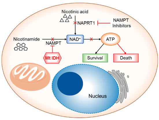 In attempts to identify the metabolic dependencies because of disrupted IDH function, Tateishi et al. found the profound vulnerability of IDH1 mutant glioma cells to the depletion of the NAD+ cofactor [136]. IDH mutations lead to a depletion of NAD+ pools, which is a known as key metabolite [151]. NAD+ levels in cells are maintained through a salvage pathway which has two branches that are regulated mainly by the salvage pathway enzymes, namely, the NAPRT1 (Nicotinate phosphoribosyltransferase 1) and NAMPT (Nicotinamide phosphoribosyltransferase). IDH1 mutations downregulate NAPRT, a rate-limiting enzyme in NAD+ salvage synthesis through the D-2HG mediated hypermethylation of NAPRT1 promoter CpG islands. The use of NAMPT inhibitors (synthetic lethality) caused a severe metabolic crisis inducing the activation of AMPK, and autophagy-mediated cell death in glioma cells and in mice harboring intracranial IDH mutant glioma xenografts. Several inhibitors of NAMPT are available and this strategy can be deemed as an effective and selective approach to kill IDH mutant cells as summarized in Figure 5.