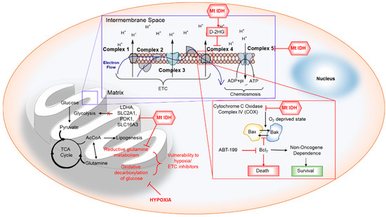 - Grassian, A.R.; Parker, S.J.; Davidson, S.M.; Divakaruni, A.S.; Green, C.R.; Zhang, X.; Slocum, K.L.; Pu, M.; Lin, F.; Vickers, C.; et al. IDH1 mutations alter citric acid cycle metabolism and increase dependence on oxidative mitochondrial metabolism. Cancer Res. 2014, 74, 3317–3331. [Google Scholar] [CrossRef] [PubMed]
