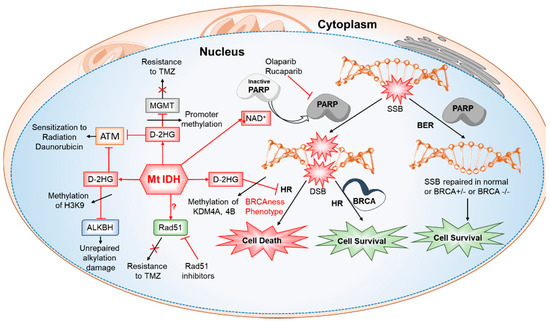 - Inoue, S.; Li, W.Y.; Tseng, A.; Beerman, I.; Elia, A.J.; Bendall, S.C.; Lemonnier, F.; Kron, K.J.; Cescon, D.W.; Hao, Z.; et al. Mutant IDH1 downregulates ATM and alters DNA repair and sensitivity to DNA damage independent of TET2. Cancer Cell 2016, 30, 337–348. [Google Scholar] [CrossRef] [PubMed]
