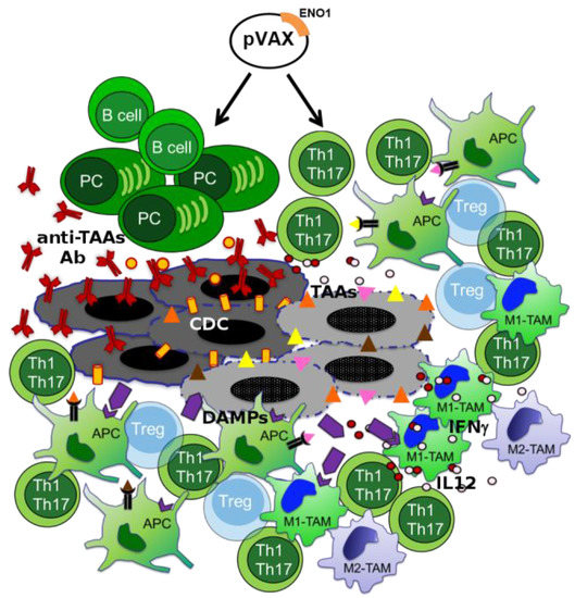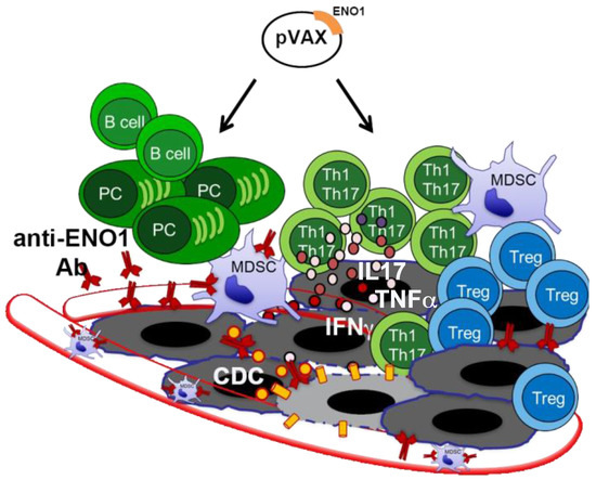 Alpha-enolase (ENO1) DNA vaccination effects in pancreatic ductal adenocarcinoma (PDA) mouse model. Cartoon shows the multiple effects of ENO1 DNA vaccination on the antitumor immune response (black arrows): activation of B cells producing anti-ENO1 antibodies (Ab) that affect tumor cells and myeloid-derived suppressor cells (MDSCs) invasion and endothelial adhesion (vessels are shown as transparent red tubes). Moreover, vaccine induces complement-dependent cytotoxicity (CDC) of tumor cells (grey cells) and T cells, specially Th1/Th17 cells that release IL17, TNFα and IFNγ cytokines. Yellow circles and cylinders indicate the complement system and the membrane attack complex, respectively, involved in the CDC. Circles represent cytokines; plasma cell (PC).