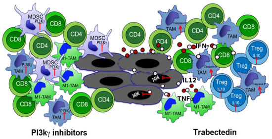 Phosphoinositide 3-Kinaseγ (PI3Kγ) inhibitor (left) and Trabectedin (right) effects on immune cells. CD8 recruitment dependent from M1-TAM switch of TAM and MDSC after PI3Kγ inhibition is represented. Caspase-8 activation and cytokine production induced by Trabectedin in TAM, IFNγ production by T cells and IL10 inhibition in Treg are shown.